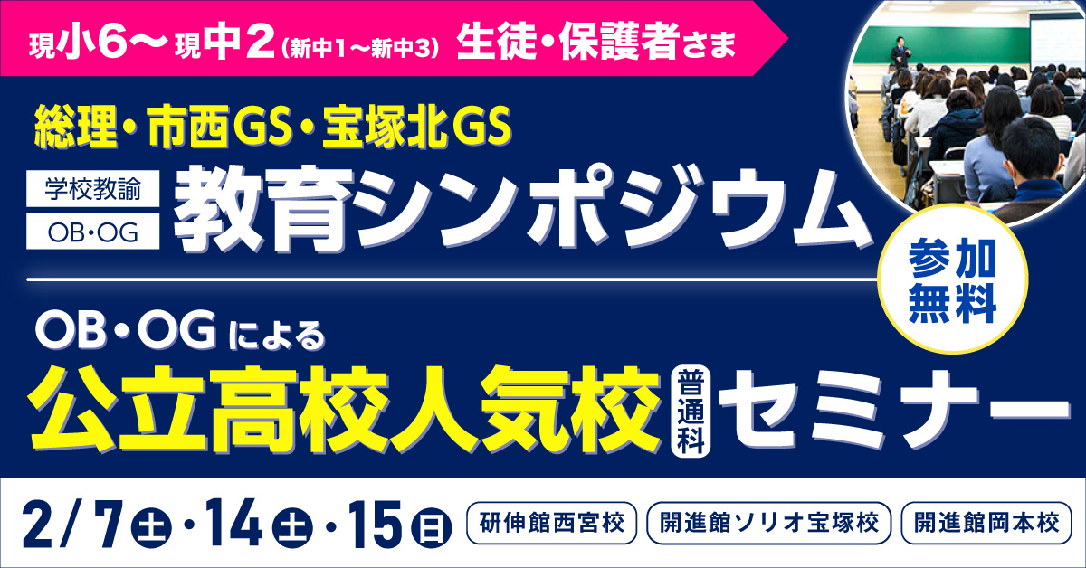 神戸総理・市西GS・宝塚北GS を目指す方のための教育シンポジウム、公立高校人気校普通科を目指す方のためのOB・OG セミナーを2月に開催します。