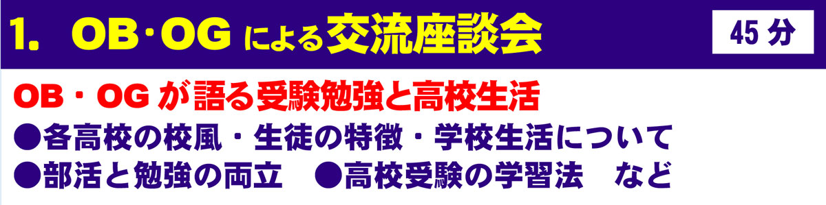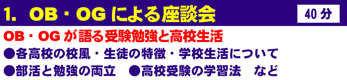 前半は「OB・OG による座談会」をおこないます。校風や学校生活、部活と勉強の両立、高校受験の学習法などについて、自分の経験を踏まえて詳しくお話ししてくださいます。