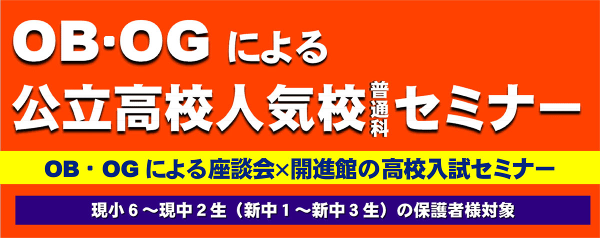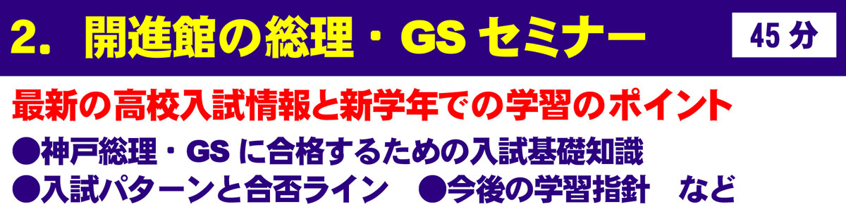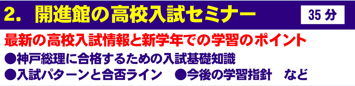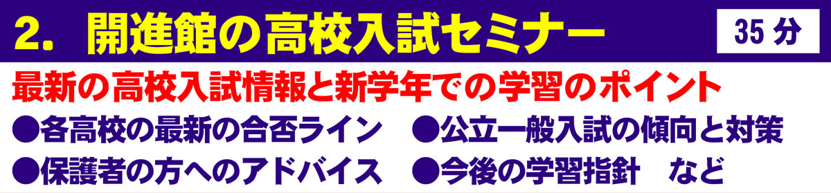 後半の「開進館の高校入試セミナー」では、最新の高校入試情報と新学年での学習のポイントをお伝えします。