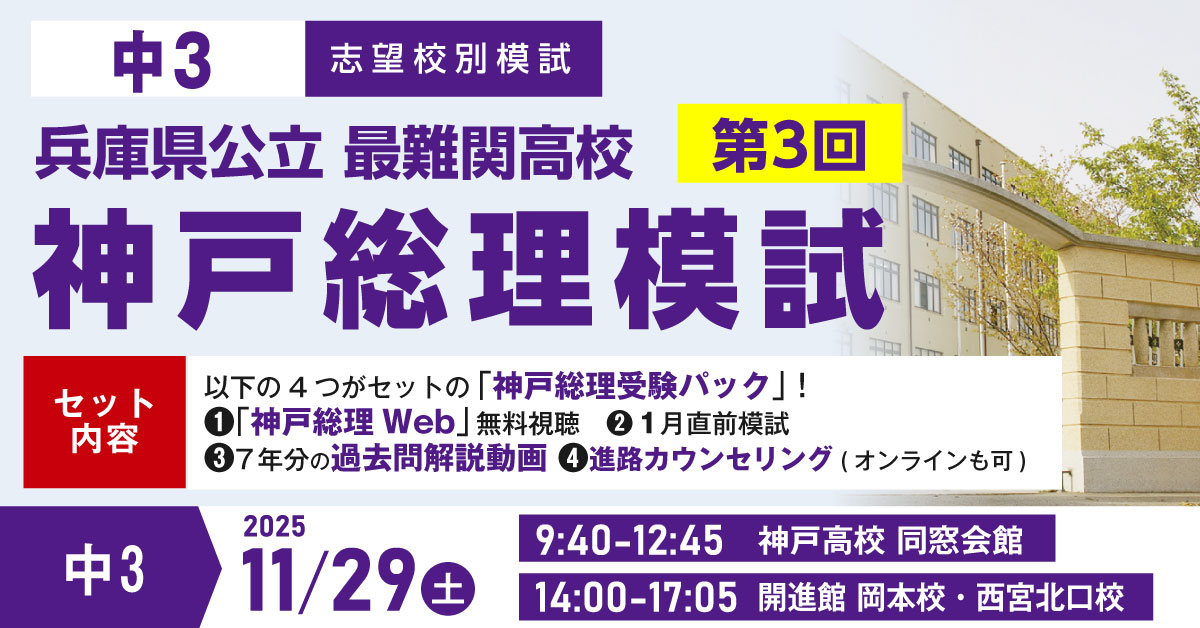 日程 | 11/29(土) 9:40~12:45 神戸高校同窓会館 14:00~17:05 開進館岡本校・開進館西宮北口校 案内をみる |