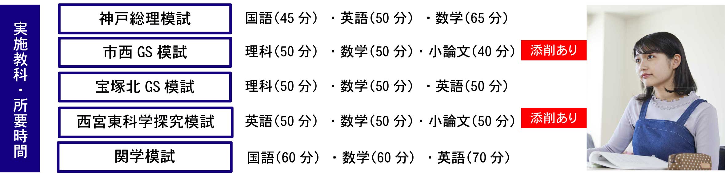 | 科目 | 中3公立高校診断テスト 英語(50 分)/数学(50 分)/国語(40 分)/理科(40 分)/社会(40 分) ※1教科からの受験も可能です 中3志望校別模試 神戸総理模試 国語(45 分) ・英語(50 分) ・数学(65 分) 市西GS模試 理科(50 分) ・数学(50 分)・小論文(40 分) 宝塚北GS模試 理科(50 分) ・数学(50 分) ・英語(50 分) 西宮東科学探究模試 英語(50 分) ・数学(50 分)・小論文(50 分) 関学模試 国語(60 分) ・数学(60 分) ・英語(70 分) |