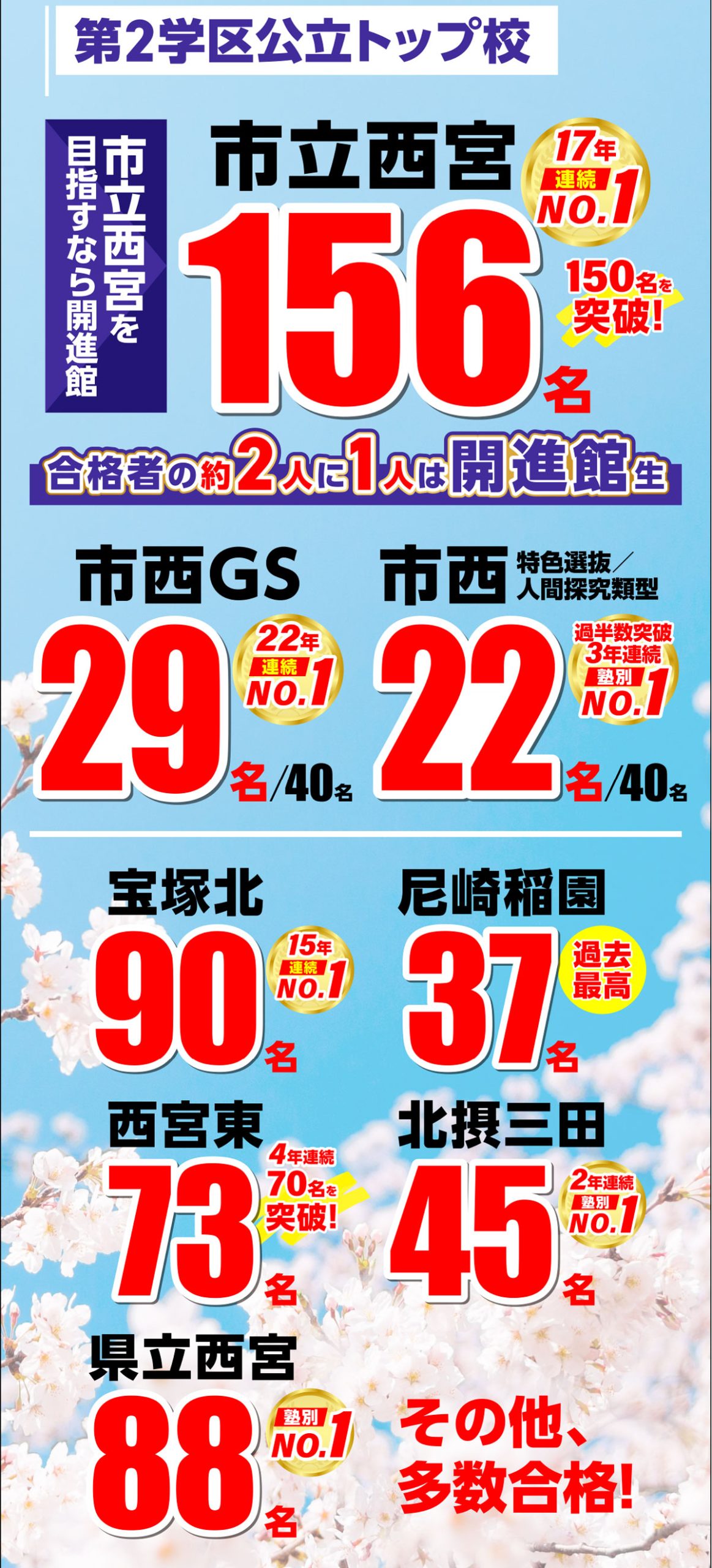 開進館 逆瀬川校は、小学生低学年から中学生、そして併設する研伸館ハイスクールに通う高校生など、たくさんの生徒さんが通われており、常に活気に満ち溢れています。 公立高校(市立西宮高校・宝塚北高校・宝塚西高校・県立西宮高校など)だけでなく、国私立高校(関西学院高等部・大教大附属池田など)への合格者も多く輩出しています。