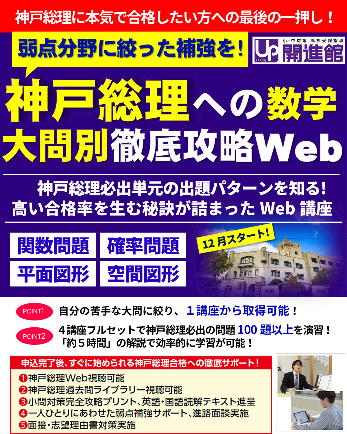 兵庫県公立高校最難関の神戸高校 総合理学科(神戸総理)。入試では、高度な考え方や解法が要求されます。その神戸総理の数学攻略のために、大問をピックアップして解説!最後の追込み期の今こそ、神戸総理合格を確実にするため、是非受講ください。