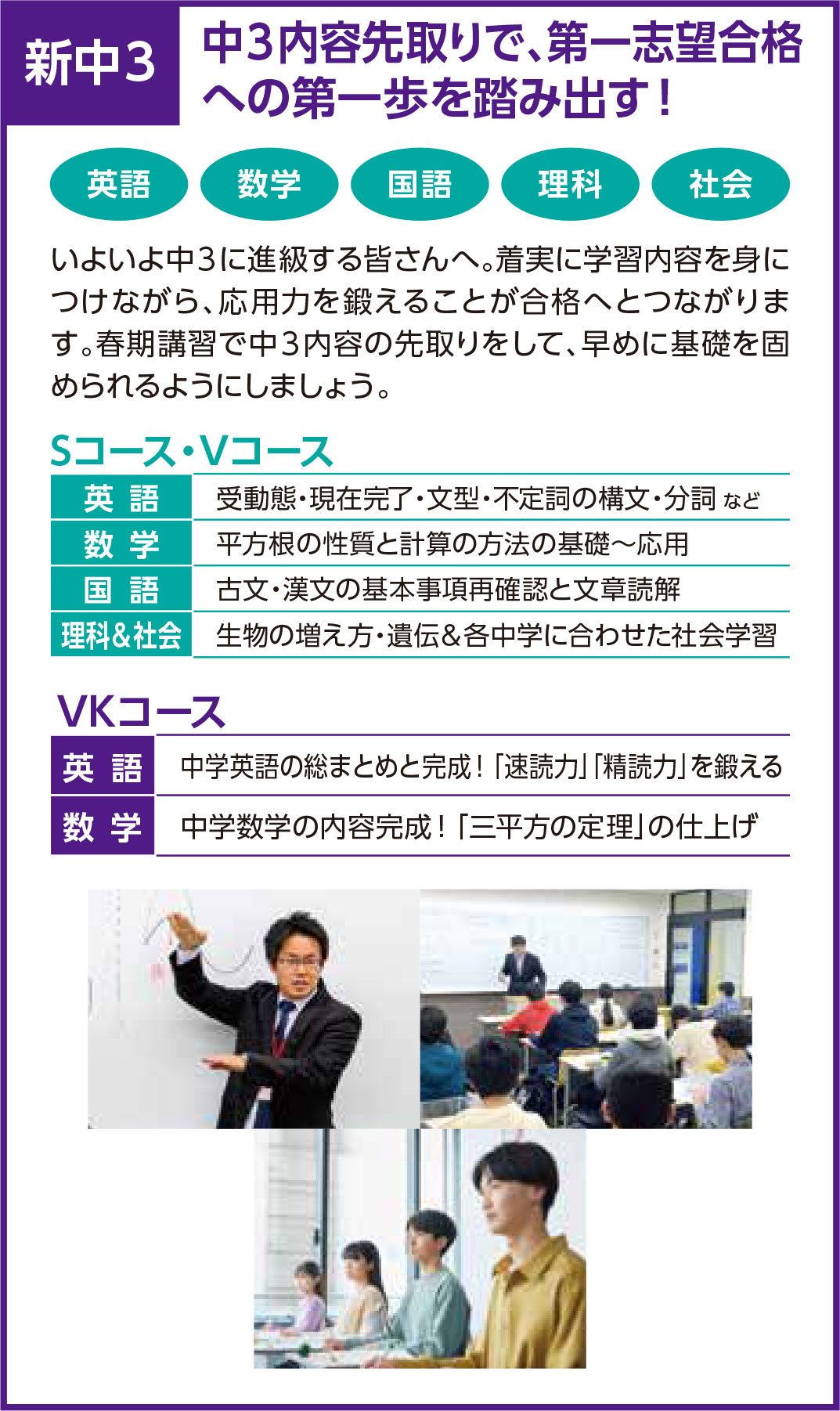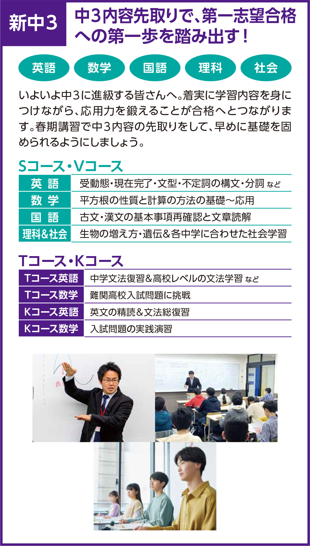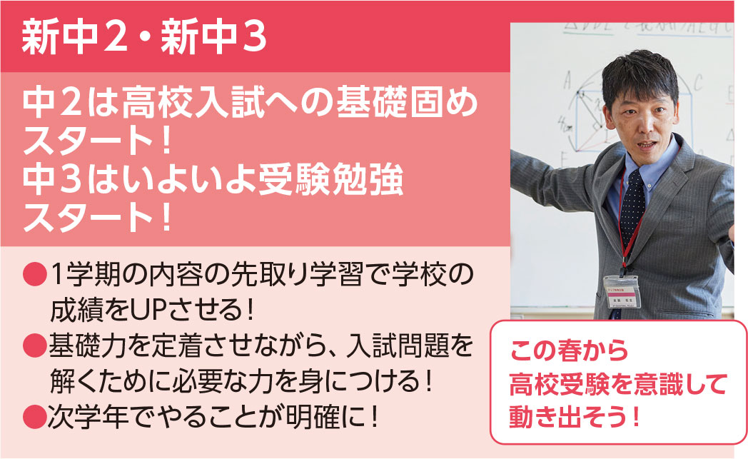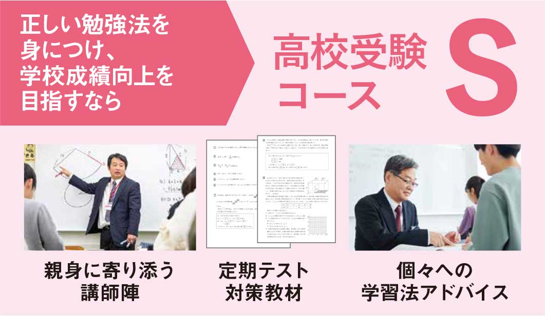 公立人気高校や有名私立高校を目指すクラスです。基本内容の定着を重視した体系化されたカリキュラムと定期テスト対策指導で、第一志望校に合格する力を養成していきます。