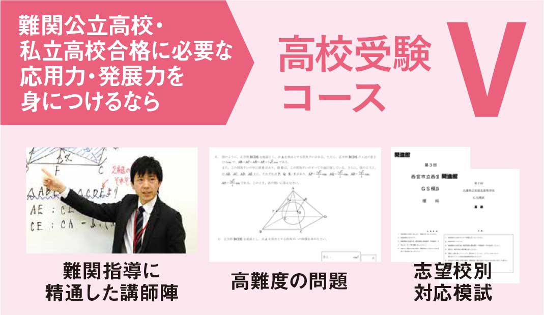 市西GS・宝塚北GS・公立トップ校や難関私立高校を目指すクラスです。基本から応用・発展内容までを広く扱うカリキュラムを進めながら、定期テスト対策指導と併せて、第一志望校を突破する力を養成していきます。