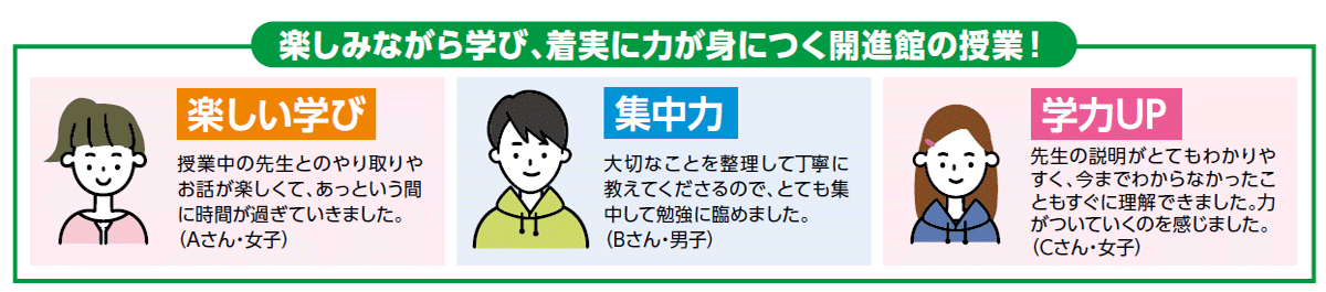 開進館の授業では、長年研究を重ね開発したカリキュラムと教材を基に、「学習内容を真に理解する」ことを意識して指導しています。また、成績を上げるためには、勉強に対する前向きな姿勢が必要であると考えています。
